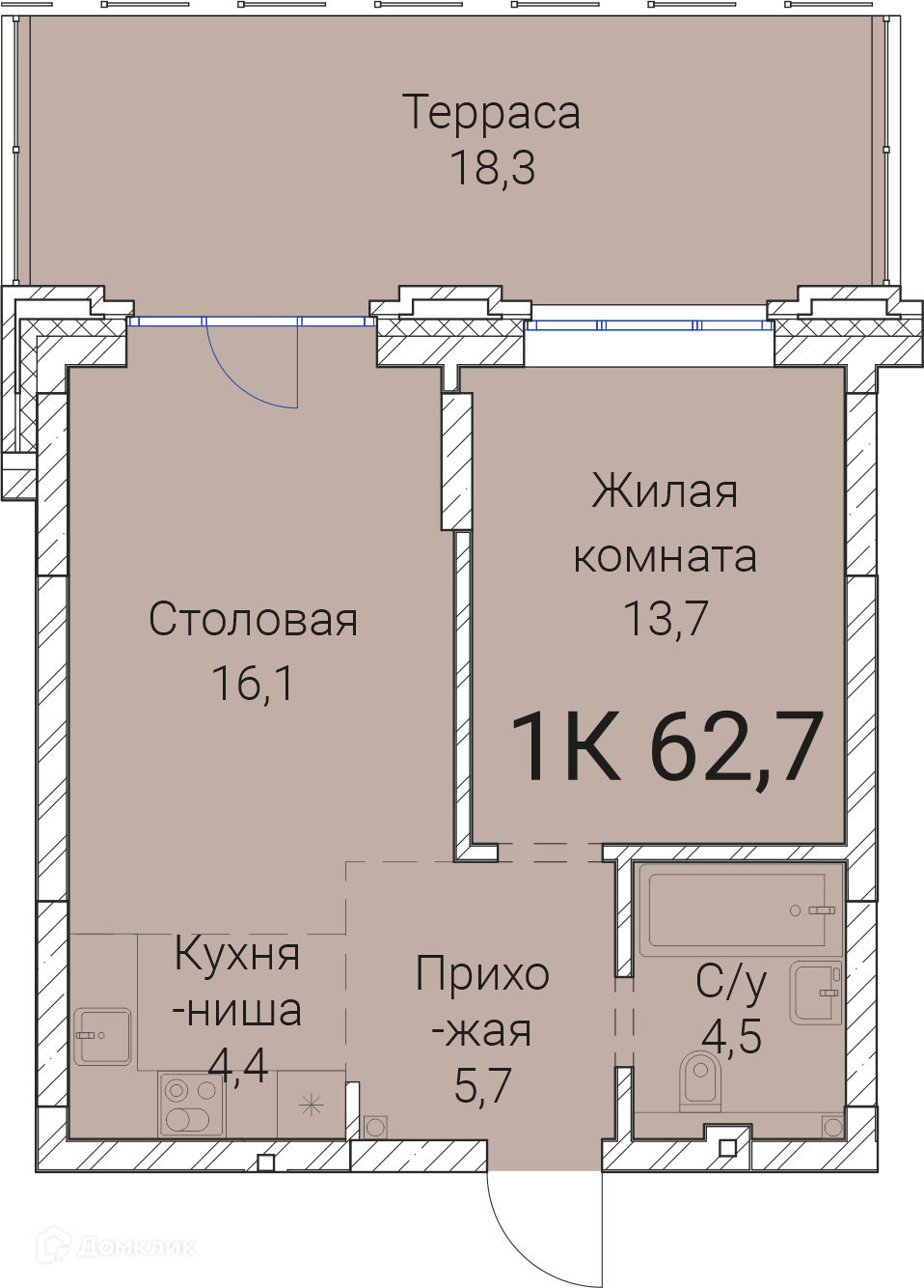 - Общая площадь: 62.7 м²