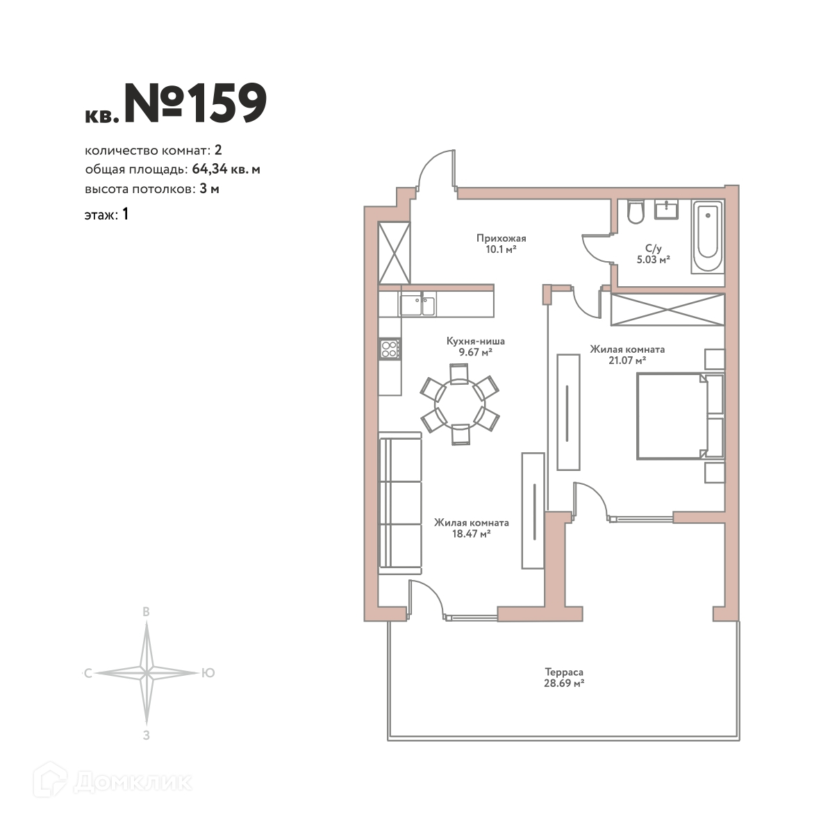 - Общая площадь: 64.34 м²