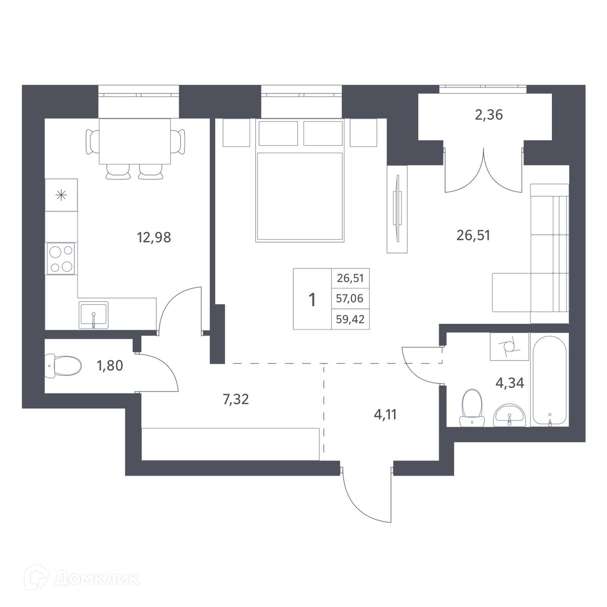 - ✅ Светлая жилая площадь: 26.51 м².