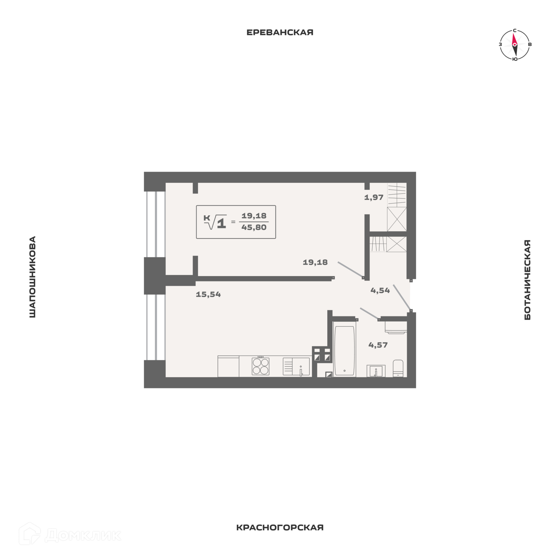 Планировка 1 комн. в ЖК Ньютон