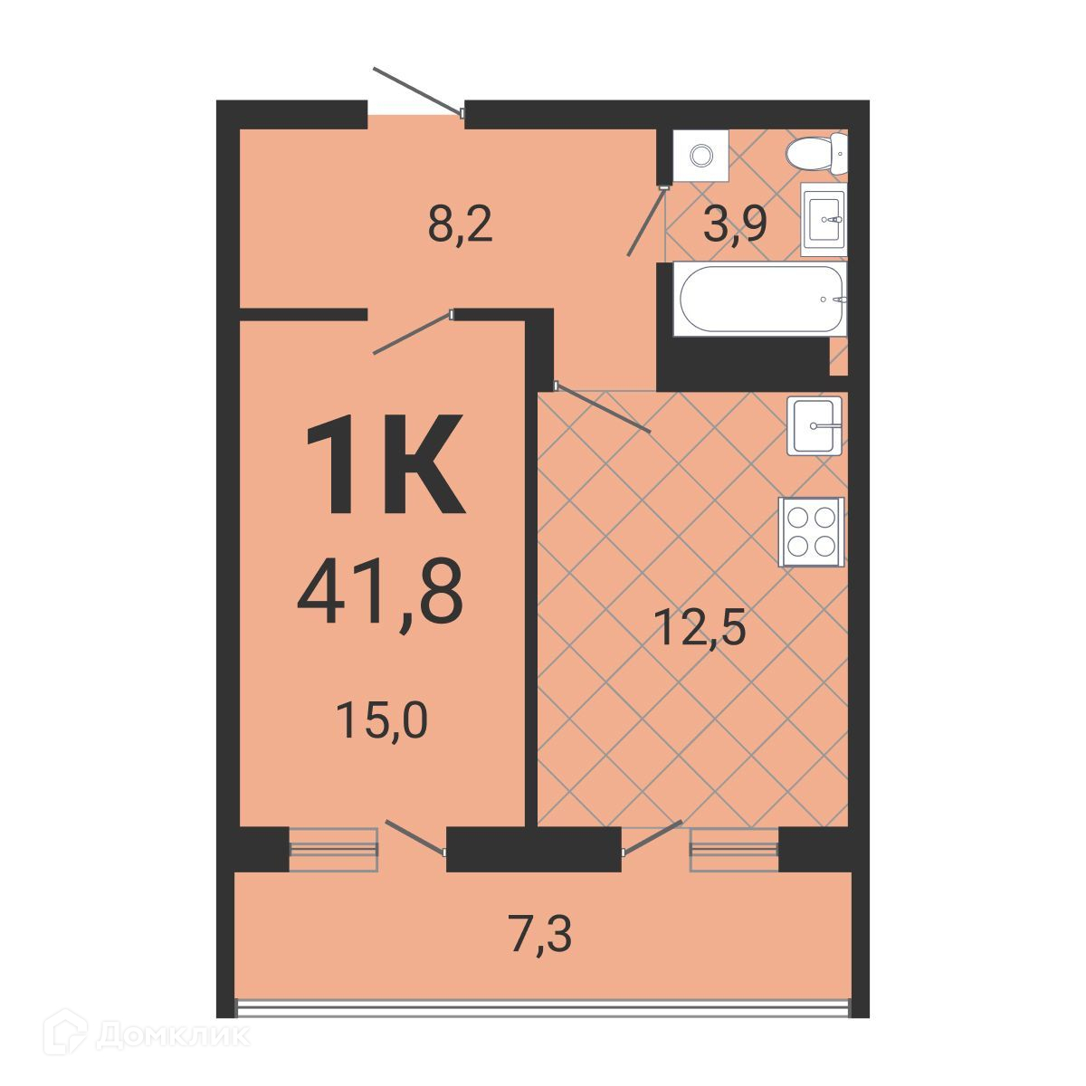 - Общая площадь: 41.4 м²