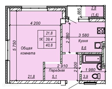 • Площадь - 40.8 м²