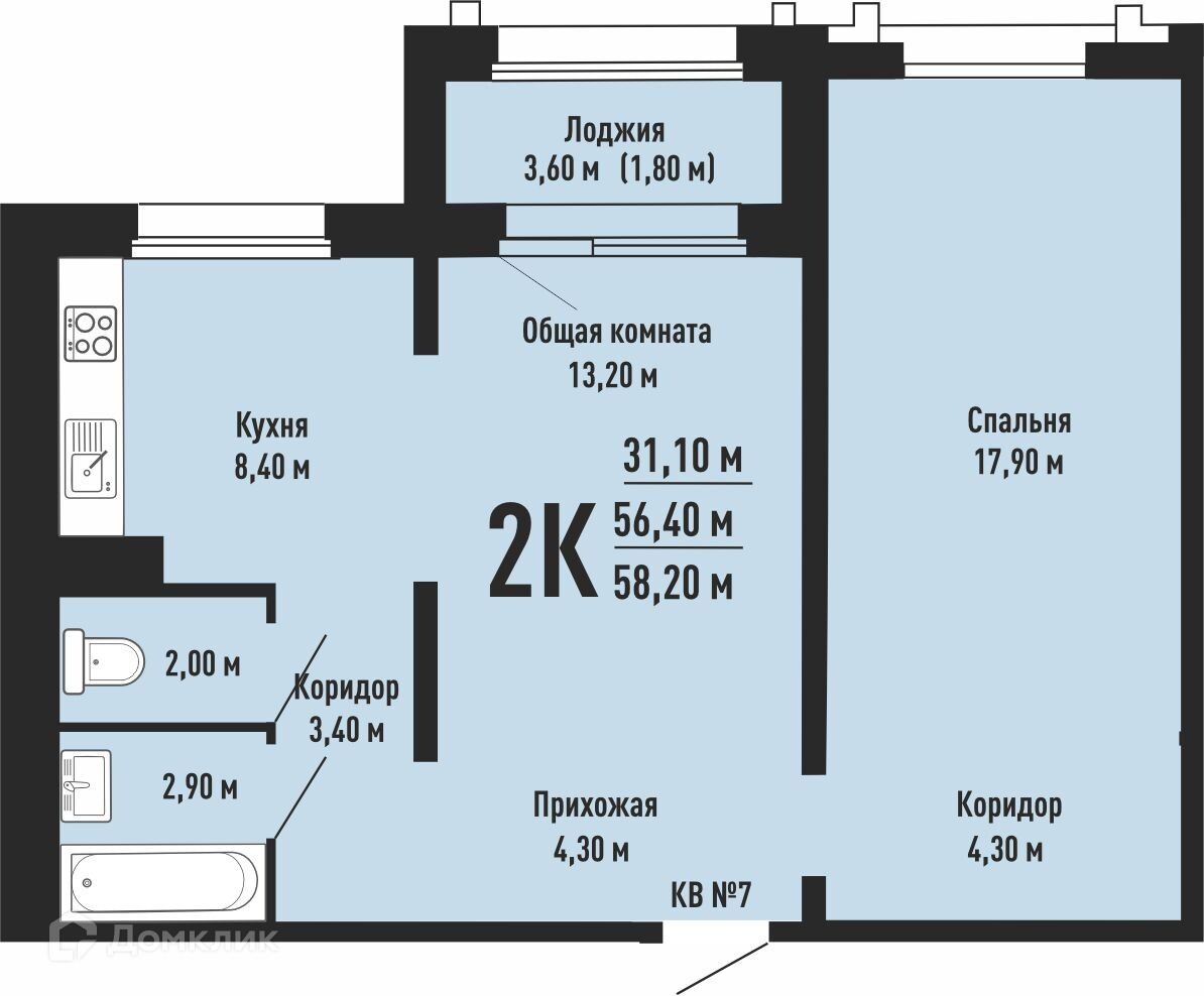 • Площадь - 58.2 м²