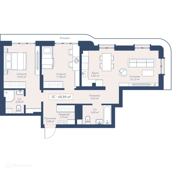 3 комн. квартира в Новосибирске в ипотеку от 69 633 руб/месяц