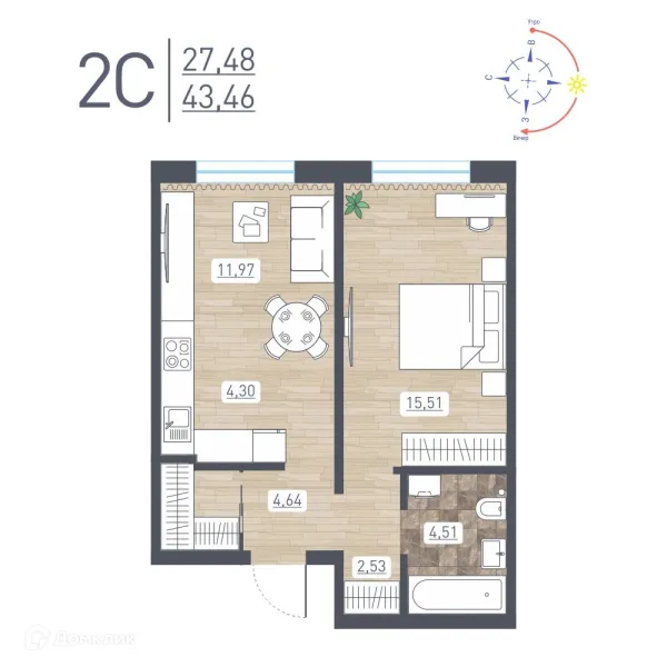 2 комн. квартира в Новосибирске в ипотеку от 44 862 руб/месяц