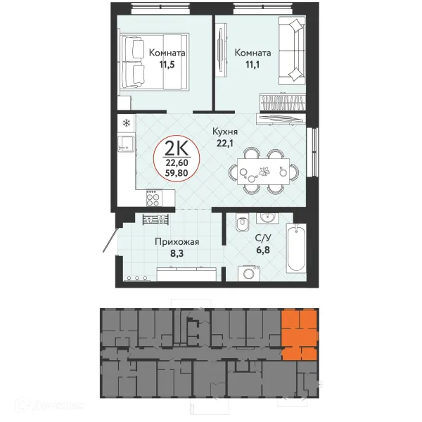 2 комн. квартира в Новосибирске в ипотеку от 60 128 руб/месяц