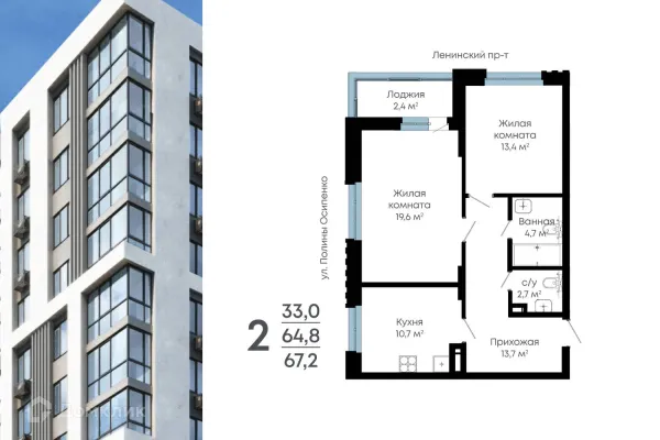 2 комн. квартира в Воронеже в ипотеку от 60 422 руб/месяц