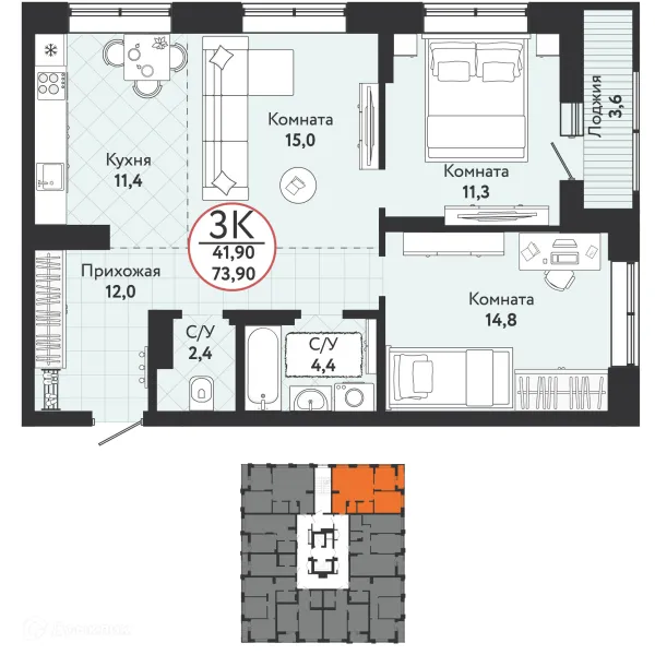 3 комн. квартира в Новосибирске в ипотеку от 72 730 руб/месяц