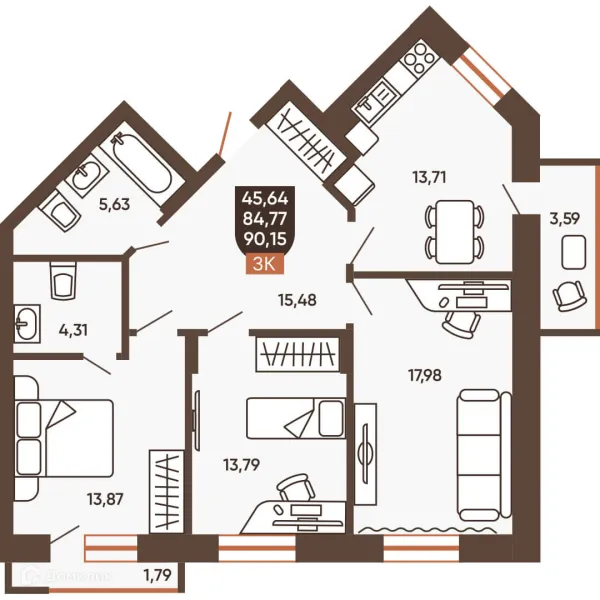 3 комн. квартира в Новосибирске в ипотеку от 90 732 руб/месяц