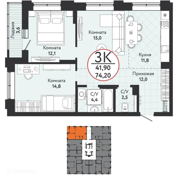 3 комн. квартира в Новосибирске в ипотеку от 76 546 руб/месяц