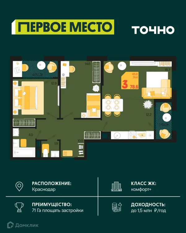 3 комн. квартира в Краснодаре в ипотеку от 74 145 руб/месяц