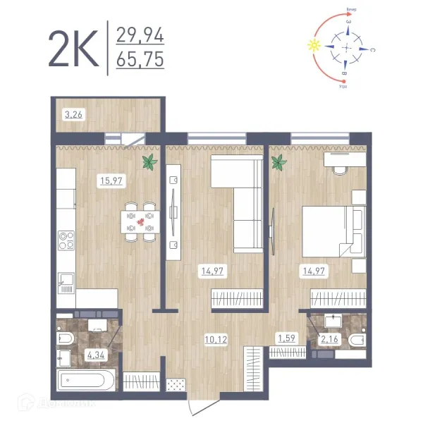 2 комн. квартира в Новосибирске в ипотеку от 32 834 руб/месяц