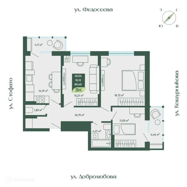 3 комн. квартира в Новосибирске в ипотеку от 92 893 руб/месяц