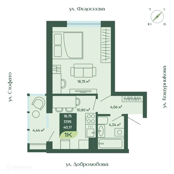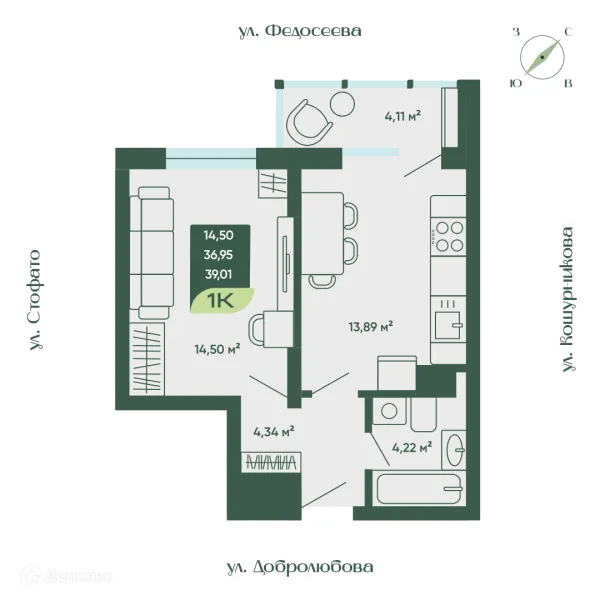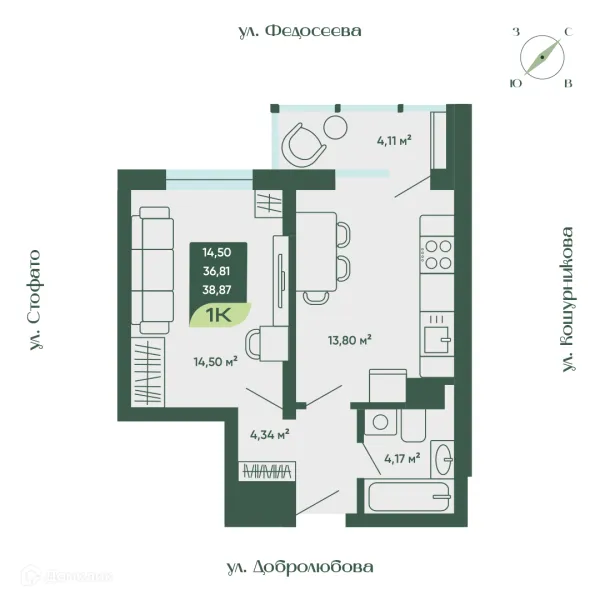 1 комн. квартира в Новосибирске в ипотеку от 57 752 руб/месяц