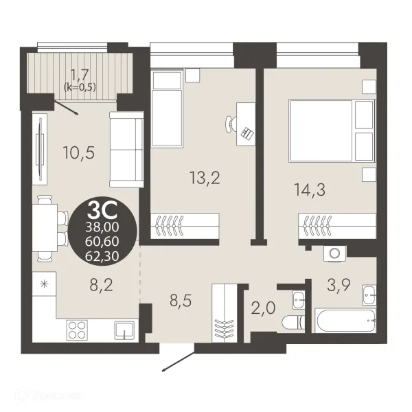 2 комн. квартира в Новосибирске в ипотеку от 57 536 руб/месяц